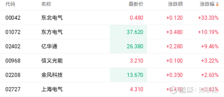 财联社3月4日讯(编辑 胡家荣)港股电力产业链个股显著走强。截至发稿,东北电气(00042.HK)涨33.33%、东方电气(01072.HK)涨10.19%、亿华通(02402.HK)涨9.46%、信义光能(00968.HK)涨3.22%。