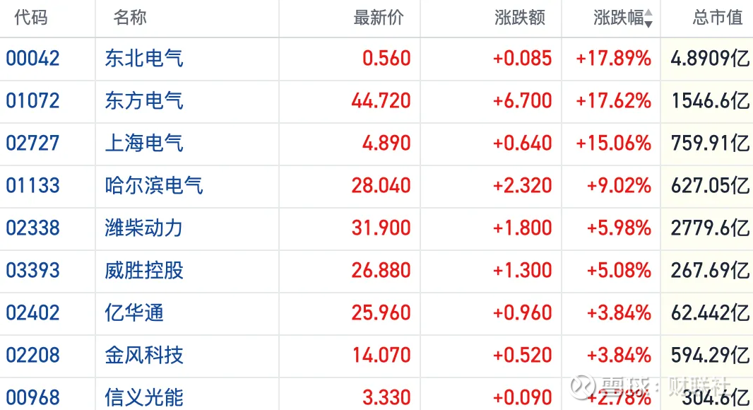 截至发稿,东北电气(00042.HK)、东方电气(01072.HK)双双涨超17%、威胜控股(03393.HK)等多只个股跟涨5%。