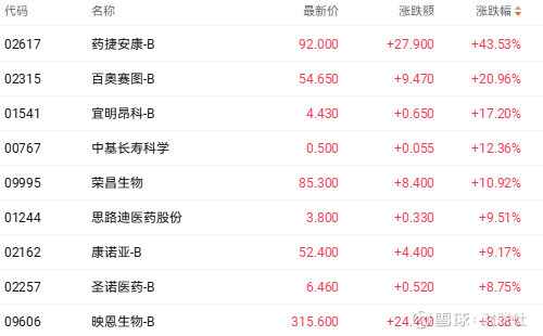 截至收盘,药捷安康-B(02617.HK)涨43.53%、百赛奥图-B(02315.HK)涨20.96%、宜明昂科-B(01541.HK)涨17.20%。