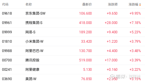 截至收盘,京东集团-SW(09618.HK)涨9.95%、网易-S(09999.HK)涨5.25%、小米集团-W(01810.HK)涨3.79%。