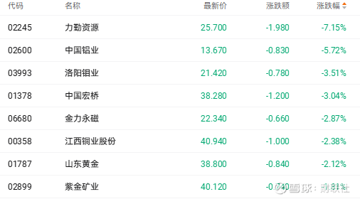 截至收盘,中国铝业(02600.HK)跌5.72%、洛阳钼业(03993.HK)跌3.51%、中国宏桥(01378.HK)跌3.04%。