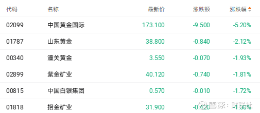 截至收盘,中国黄金国际(02099.HK)跌5.20%、潼关黄金(00340.HK)跌1.93%、紫金矿业(02899.HK)跌1.81%。