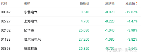 截至收盘,东北电气(00042.HK)跌12.07%、上海电气(02727.HK)跌4.47%、哈尔滨电气(01133.HK)跌3.82%。