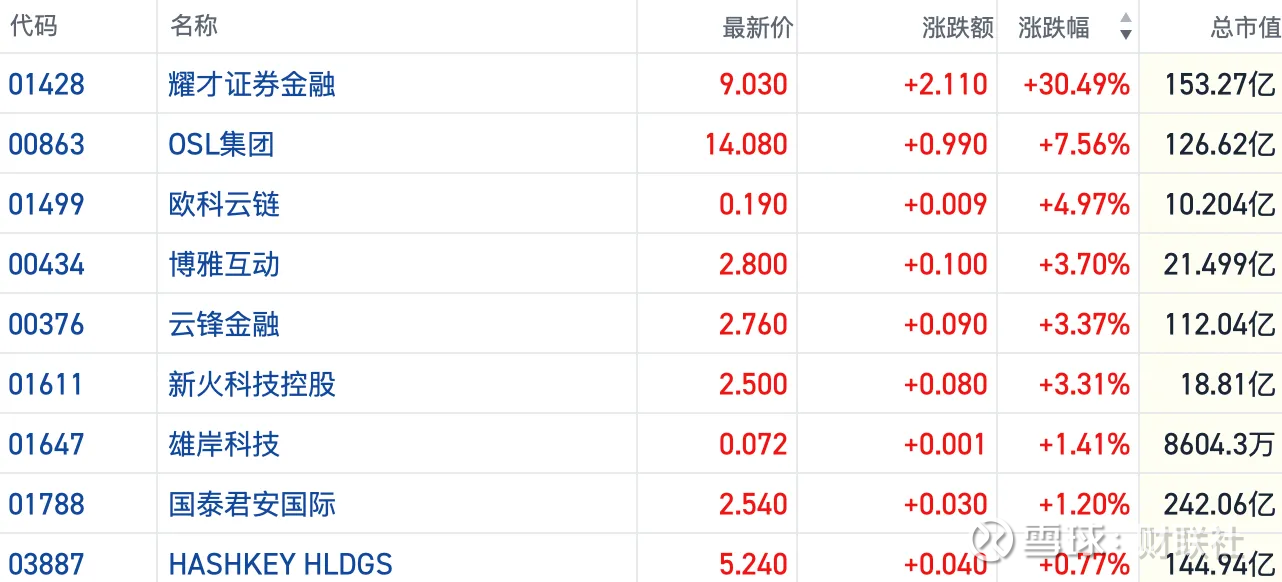 截至发稿,耀才证券金融(01428.HK)叠加蚂蚁集团收购要约延长利好涨超30%,OSL集团(00863.HK)涨约7%,云锋金融(00376.HK)等多只个股跟涨3%以上。