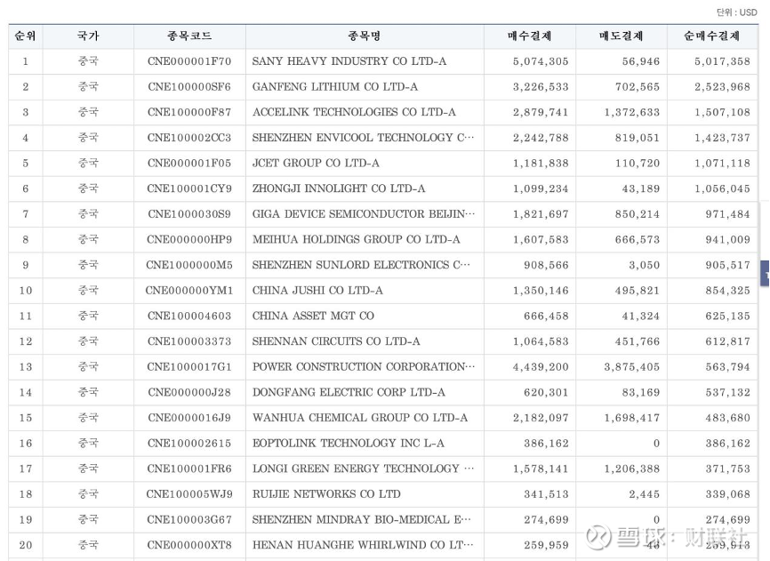 其中,公用事业领域的华润电力净买入金额为211.22万美元,风电设备龙头金风科技净买入金额177.23万美元,电力装备央企哈尔滨电气净买入金额149.80万美元;通信运营商龙头中国移动的净买入金额是83.57万美元,电力企业中国电力国际发展净买入金额74.54万美元,化工新材料龙头东岳集团净买入金额65.73万美元。这些标的多属于重资产行业,且具备稳健现金流、高股息率属性,因此成为韩国资金避险的重要选择。