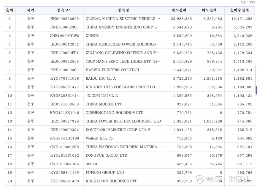港股市场方面,韩国投资者在3月2日至18日之间净买入金额前20名标的的合计净买入金额达5369.28万美元。其中,净买入金额的第一名是Global X中国电动车ETF,净买入金额是1975.13万美元;第二名是中国能源建设,净买入金额是553.52万美元。