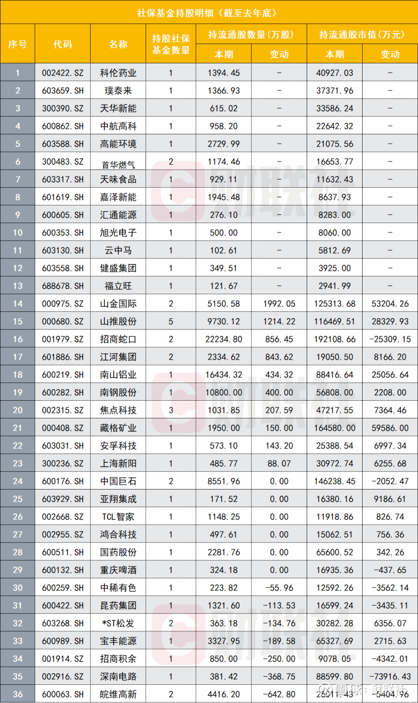 除了近期的持股变化,上市公司的年报也披露了截至去年底社保基金的调仓情况,主要集中在周期资源、化工、医药、地产物业、电子等多个板块,合计涉及了23只个股。