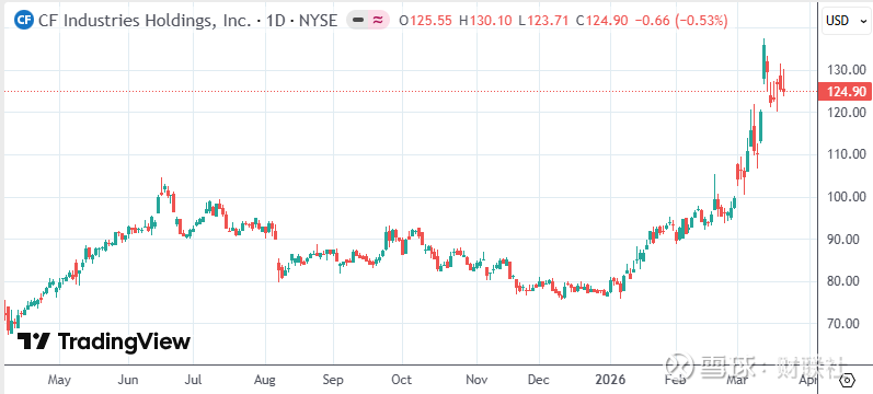 总部位于美国伊利诺伊州的CF Industries成为中东战事中的早期赢家之一。自冲突爆发以来,其股价已累计上涨25%,涨幅在标普500指数成分股中排名第三。