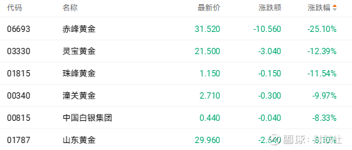 截至收盘,赤峰黄金(06693.HK)跌25.10%、灵宝黄金(03330.HK)跌12.39%、珠峰黄金(03330.HK)跌11.54%。