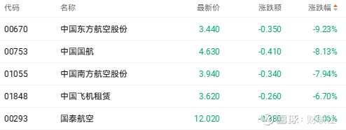 截至收盘,中国东方航空股份(00670.HK)跌9.23%、中国国航(00753.HK)跌8.13%、中国南方航空股份(01055.HK)跌7.94%。
