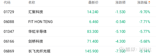 截至收盘,汇聚科技(01729.HK)跌9.70%、剑桥科技(06166.HK)跌5.68%、长飞光纤光缆(06869.HK)跌5.14%。