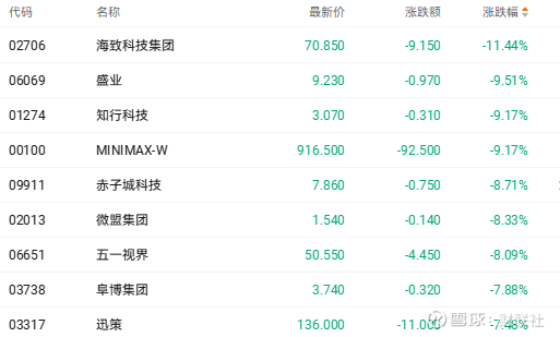 截至收盘,MINIMAX-W(00100.HK)跌9.17%、微盟集团(02013.HK)跌8.33%、五一视界(06651.HK)跌8.09%。