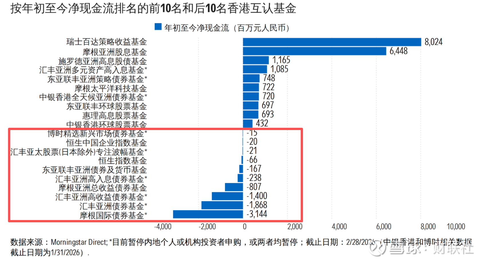 从2月数据看,香港互认基金市场并不缺资金,但增量资金的去向已明显分化。晨星数据分析显示,瑞士百达策略收益基金、摩根亚洲股息基金两只产品单月分别吸金32.71亿元、25.39亿元,带动混合型和股票型产品继续站在资金流入前列;与之对应,债券型基金整体仍处于承压区间,摩根国际债券基金、汇丰旗下多只亚洲债券基金继续出现在净流出名单前列。