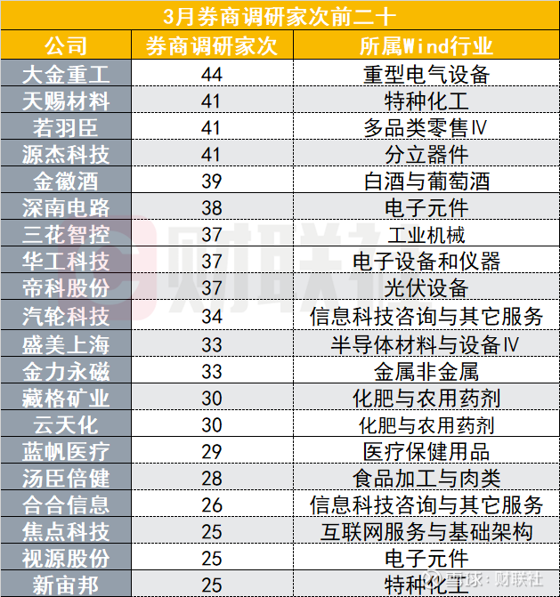 具体来看,大金重工是3月券商关注度最高的上市公司,共获得券商调研44家次;天赐材料、若羽臣、源杰科技接受调研数量均达到41家次;深南电路、三花智控、华工科技、帝科股份、盛美上海等公司也获得较高关注度。