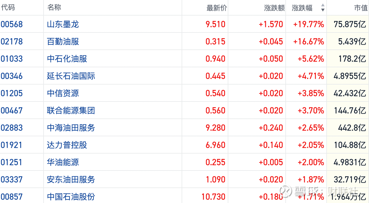 截至发稿,山东墨龙(00568.HK)涨近20%、百勤油服(02178.HK)涨约17%,延长石油国际(00346.HK)等多只个股涨超4%。