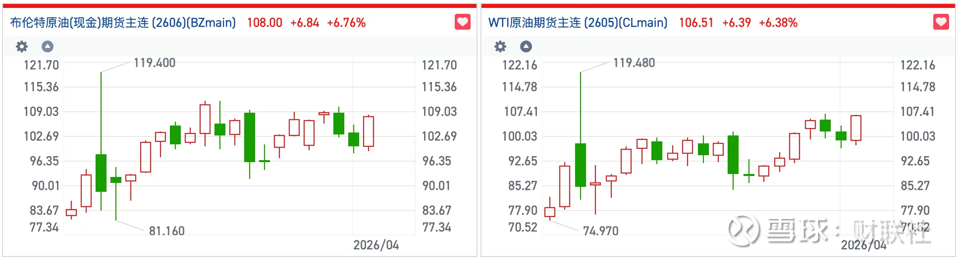而随着特朗普冲突言论的升级,亚洲交易时段,国际原油期货随即跳涨。布伦特原油期货主力合约日内一度扩大涨幅至近7%。截至发稿,布伦特原油及WTI原油期货主连均涨超6%,站稳105美元/桶。
