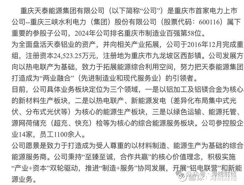 作为央企长江电力$长江电力(SH600900)$ 旗下三峡水利$三峡水利(SH600116)$ 所控股的公司,天泰能源,是正统的央企子公司序列。