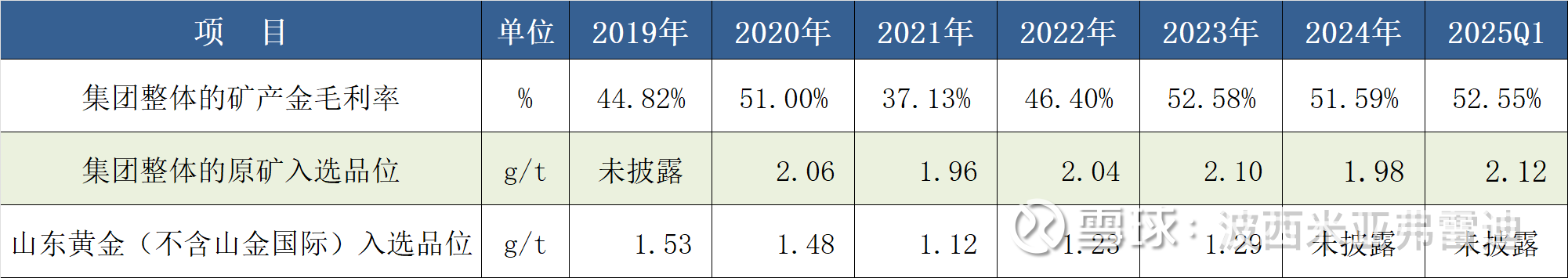 山东黄金以前在年报上披露原矿入选品位,但2024年报上未披露;山东黄金自2024年起多次公开说过下调了原矿入选品位。