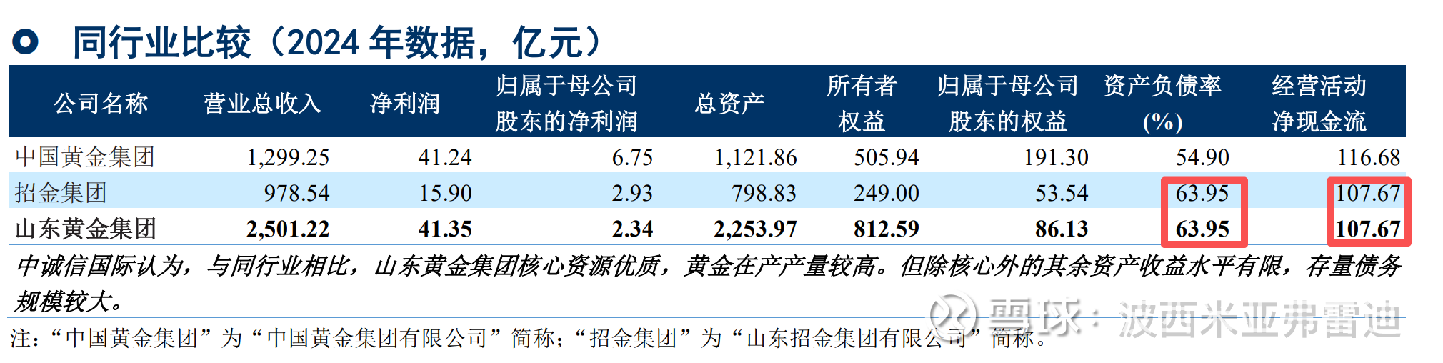 我在集团的《2025年度跟踪评级报告》中发现了一个细节,在“同行业比较”章节中有列出其他黄金集团的数据。其中资产负债率,中国黄金集团54.90%,招金集团63.95%,山东黄金集团63.95%;经营活动净现金流,中国黄金集团116.68亿元,招金集团107.67亿元,山东黄金集团107.67亿元。
