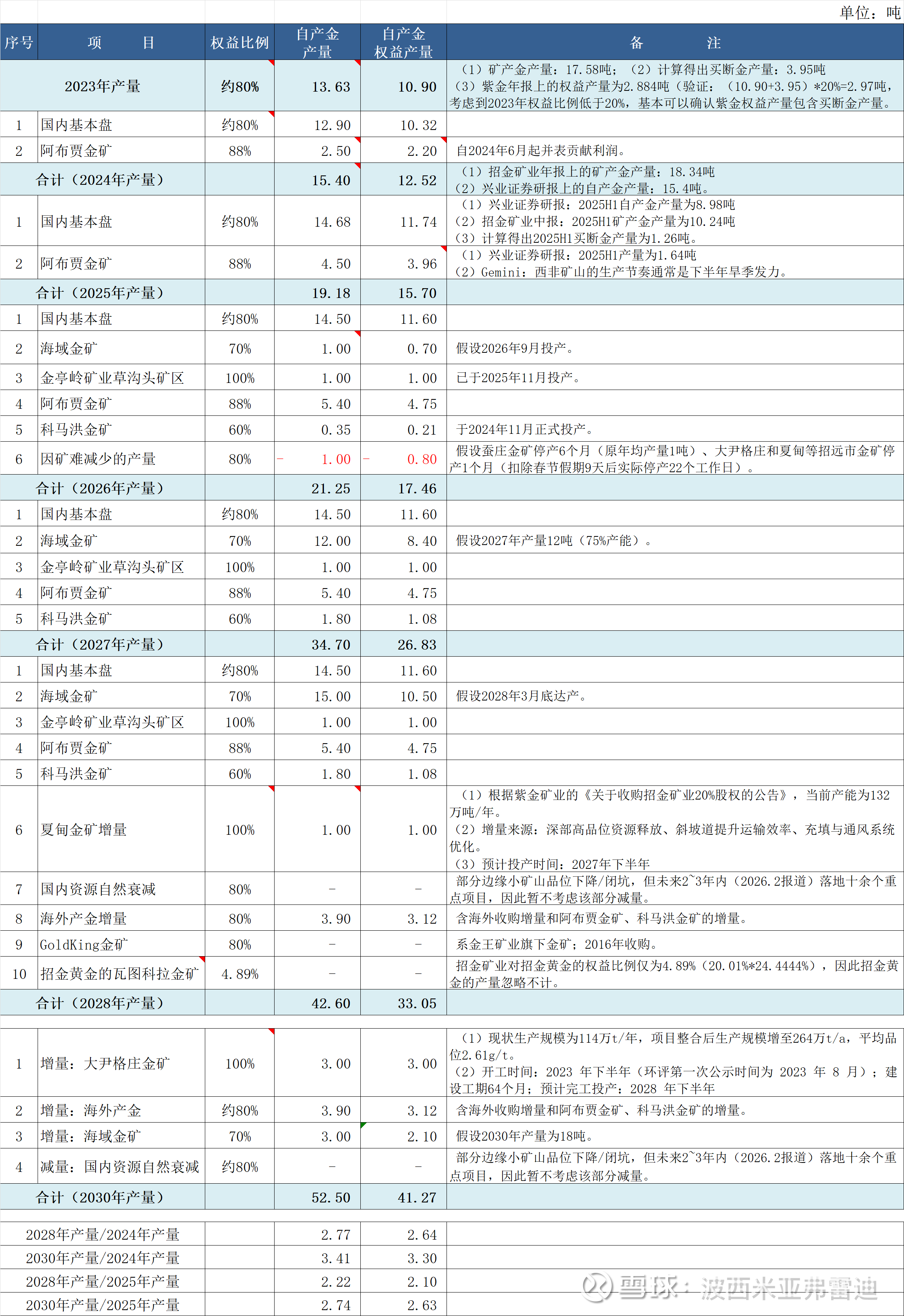 (2)招金矿业2028年权益产量预计达33.05吨,为2025年权益产量(未确定)的2.10倍;2030年权益产量预计达41.27吨,为2025年权益产量(未确定)的2.63倍。