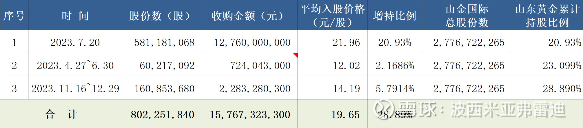 因此,山东黄金收购山金国际时发生的商誉和评估增值的计算,均以2023年8月14日为止取得的23.099%股权为准,不包含购买日之后持续收购的5.79%股权。