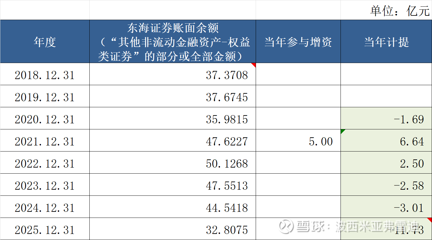 山东黄金对东海证券的投资,在年报上记在“其他非流动金融资产 - 权益类证券 ”。 2018~2025年东海证券投资账面余额及公允价值变动损失每年计提明细如下: