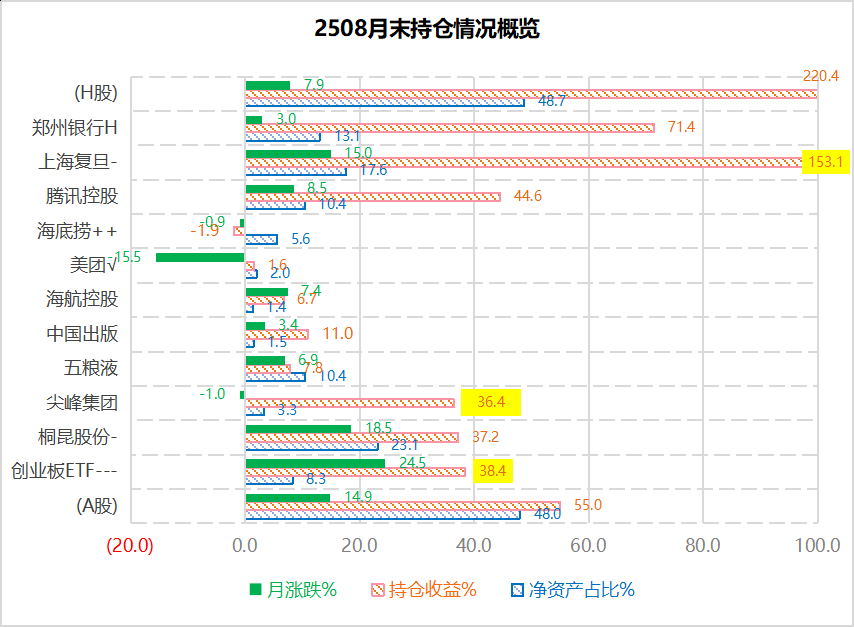 [图说明:①×表示月内清仓,-表示月内减仓1次,√表示月内新建仓,+表示月内加仓1次;②持仓占比%从2501月度起更改为净资产占比%;③持仓收益%含义与大部分软件相同,清仓后清零;④个股月涨跌%仅反映月末股价与月初股价变化;⑤A、H持仓月涨跌2507月度起更改为个股涨跌基于个股市值占A或H总持仓的比例进行的加权求和。⑥图中上海复旦、尖峰集团、创业板ETF大比例卖出后,持仓收益%用最大成本法特别标记。]