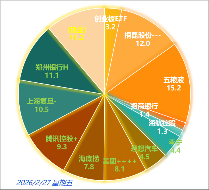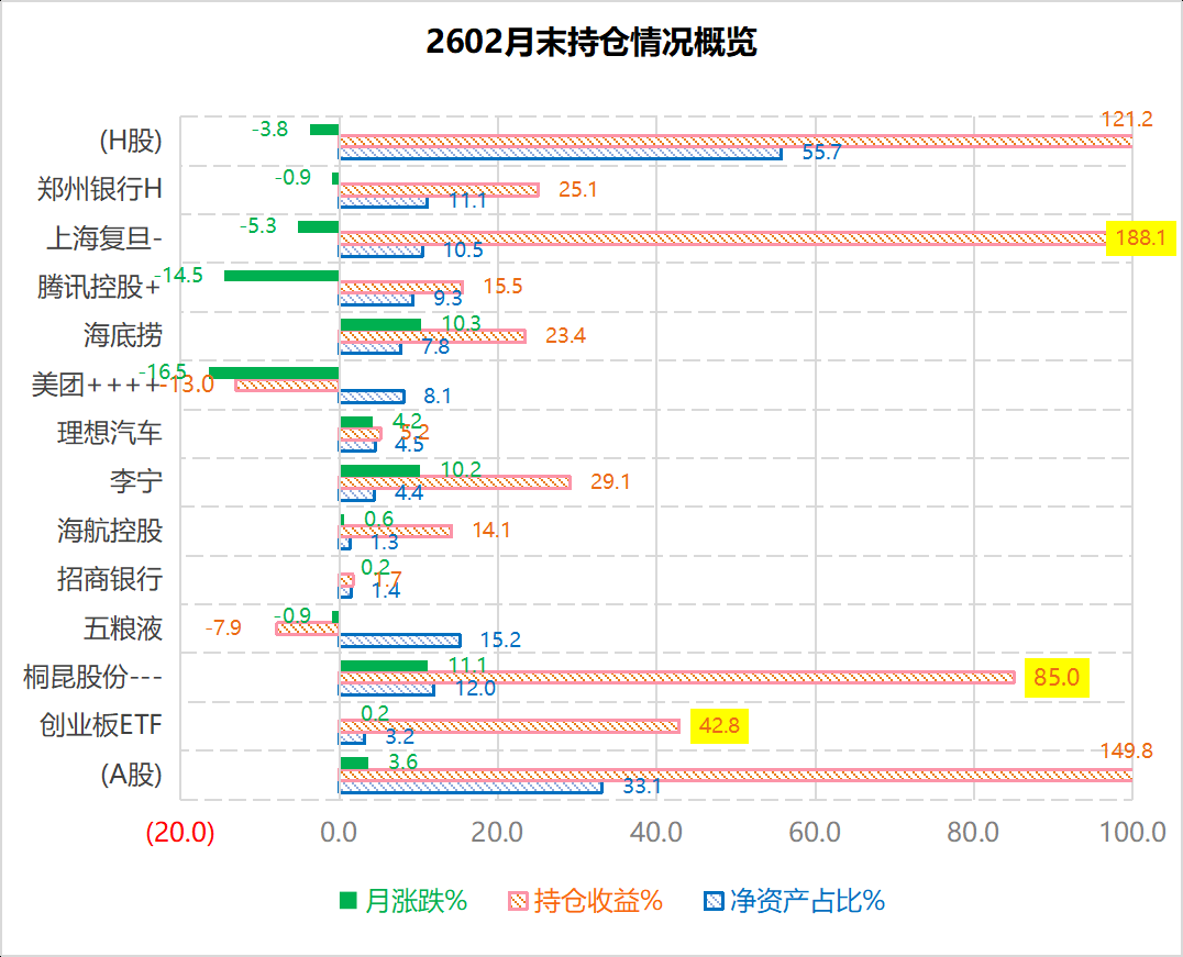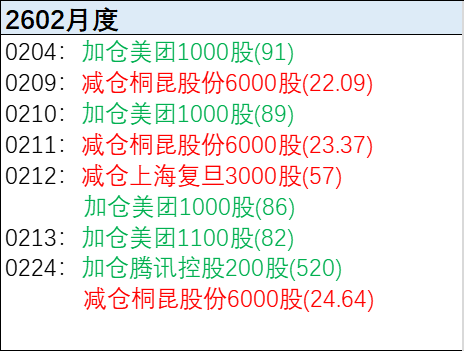 2602月底(2月27日周五收盘)持仓概览图如下。本月操作量环比基本持平,共计9笔交易(买5卖4),买、卖额分别占净资产的7.5%和10.7%,仓位下降;买盘为加仓美团、腾讯控股;卖盘为减仓桐昆股份、上海复旦。本月A股收益(+3.6%)明显好于H股(-3.8%),主要源于桐昆股份的大涨和腾讯控股的大跌。