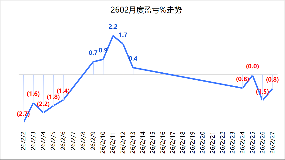 月度盈亏走势图如下:低开上行,春节前达2.2%高点后开始下跌,节后延续跌势,收在-0.8%。