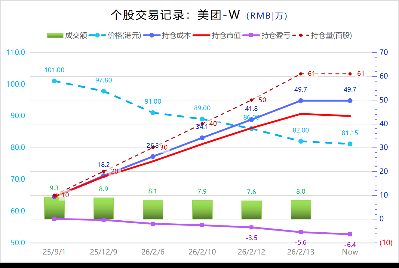 1)美团加仓4笔;历史交易记录如下,随股价下跌一路买入中