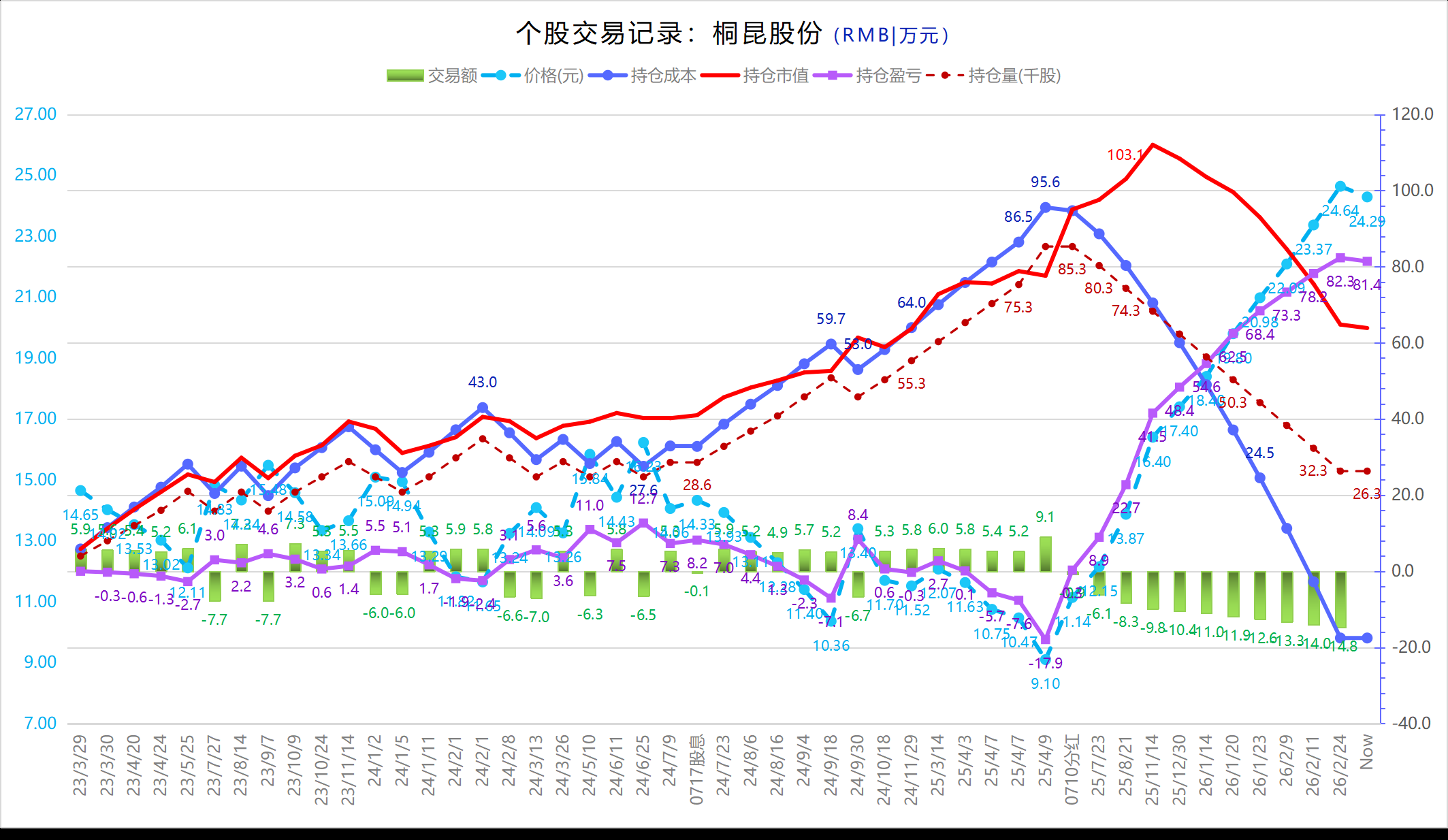2)桐昆减仓3笔;历史交易记录如下图,处于持续性的逢高卖出中;以最大投入95.6w计,持仓35个月总收益率约+85%。