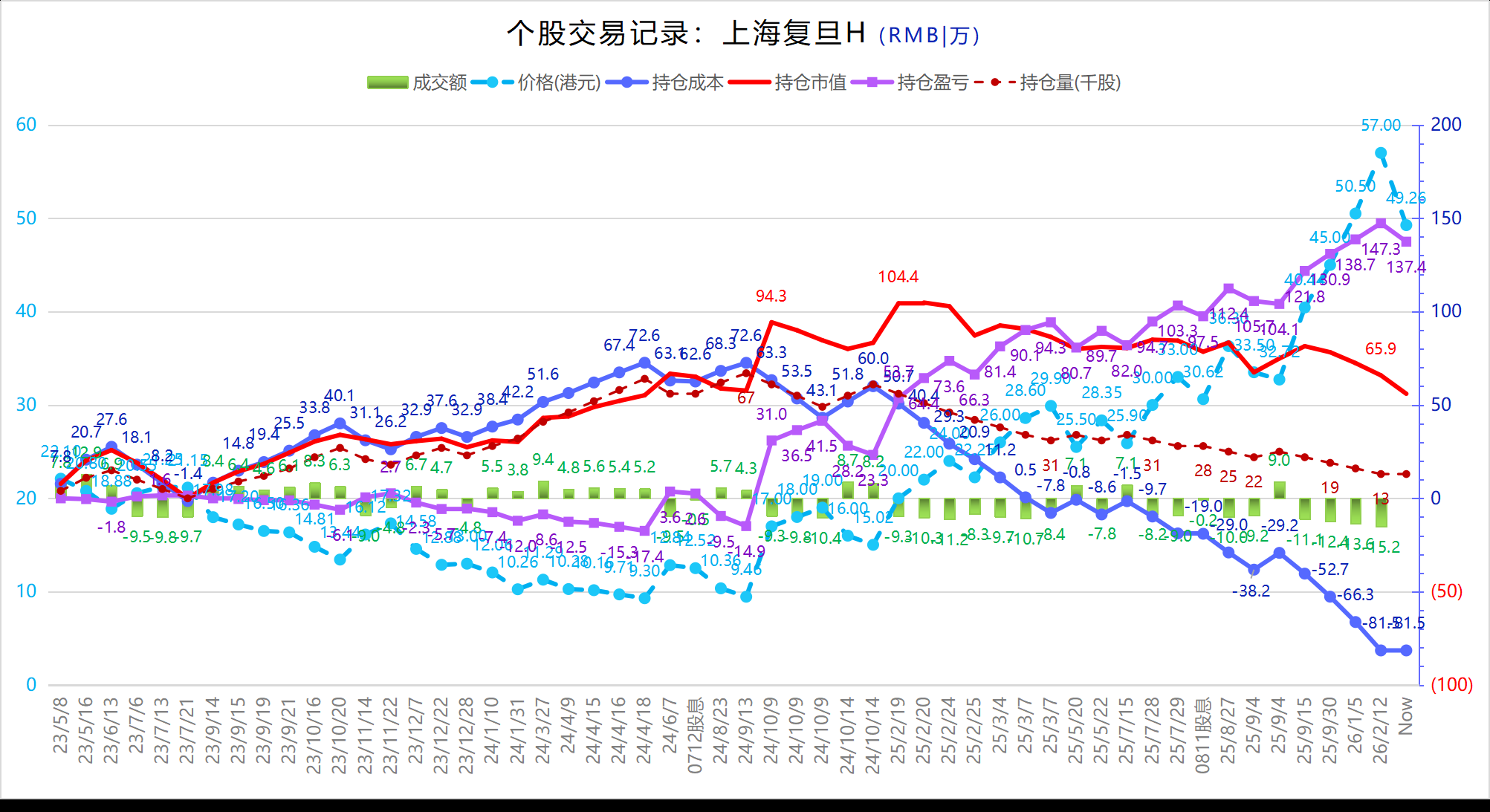 3)上海复旦减仓1笔;历史交易记录如下图,处于持续性的逢高卖出中;以最大投入72.6w计,持仓33个月,总收益率约+189%。