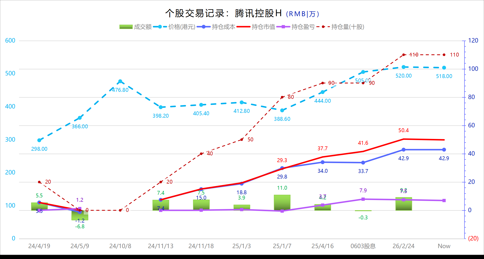 4)腾讯控股加仓1比;历史交易记录如下图,距上次买入已过去10个月,逢大跌后再增加持仓。