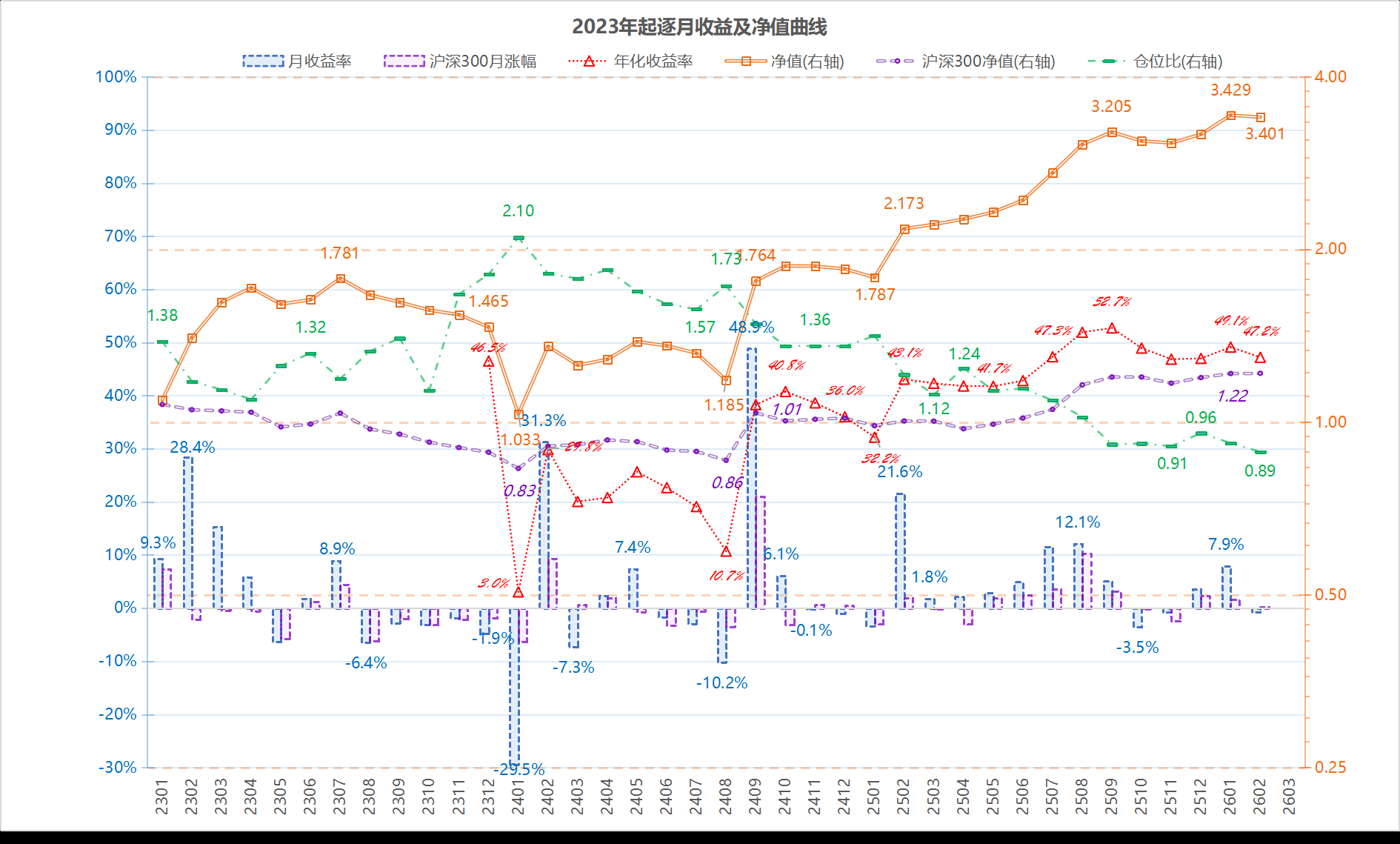 下图的“2023年起逐月及净值曲线”,以沪深300参考收益率作为对比基准。仓位处于历史低位,反映持续大涨后的守势心态。