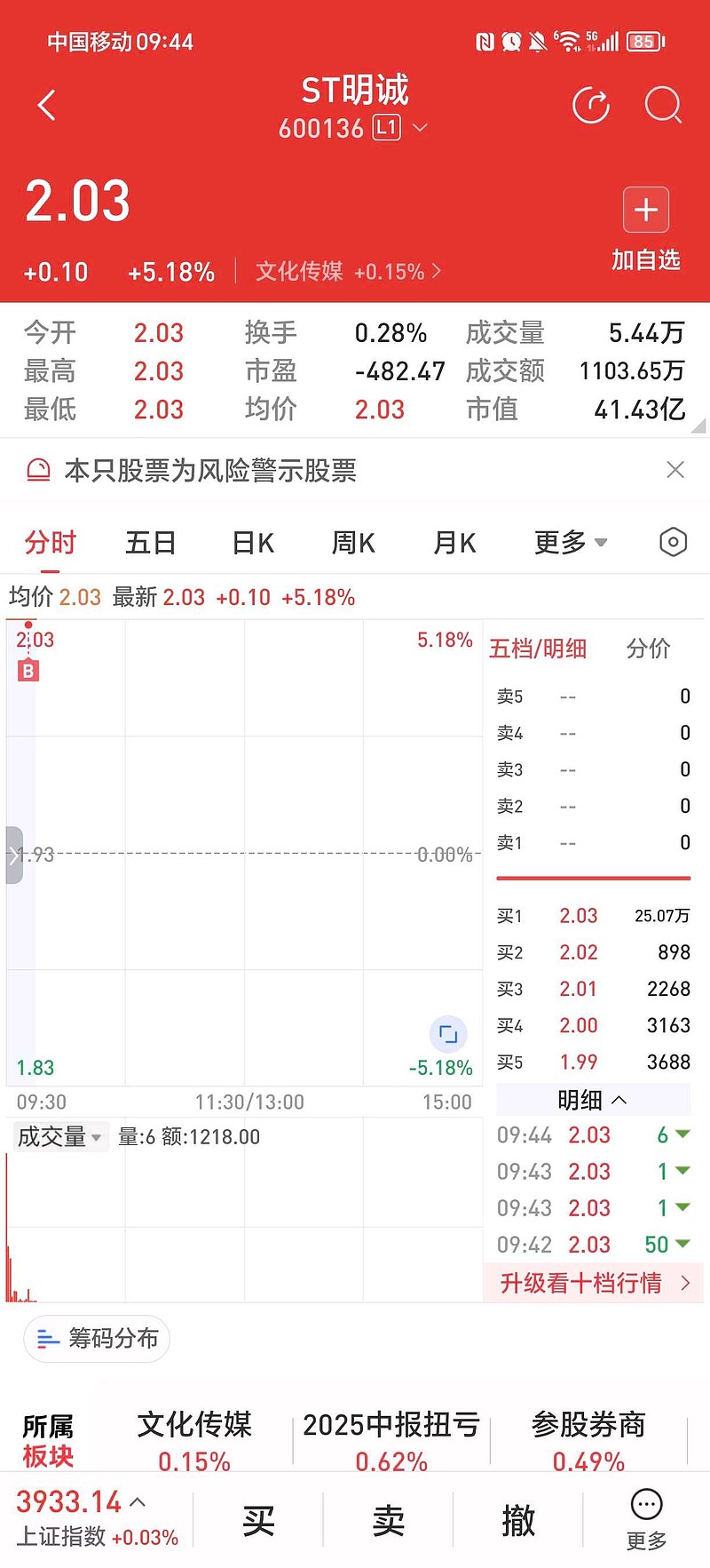 $ST明诚(SH600136)$