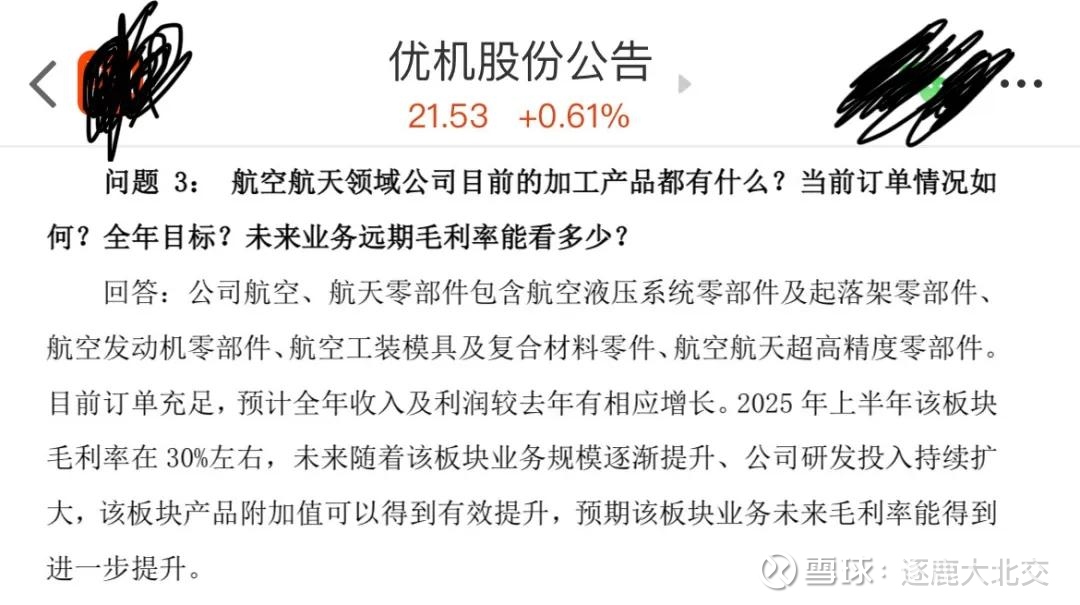 优机回答:公司航空、航天零部件包含航空液压系统零部件及起落架零部件、航空发动机零部件、航空工装模具及复合材料零件、航空航天超高精度零部件。目前订单充足,预计全年收入及利润较去年有相应增长。2025 年上半年该板块毛利率在30%左右,未来随着该板块业务规模逐渐提升、公司研发投入持续扩大,该板块产品附加值可以得到有效提升,预期该板块业务未来毛利率能得到进一步提升。