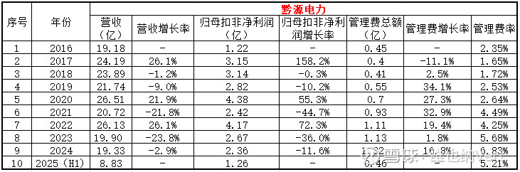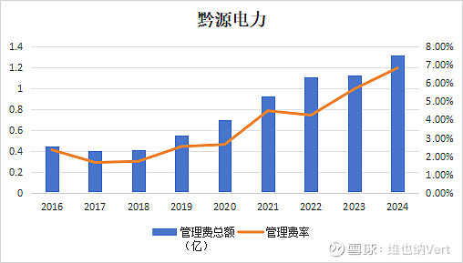 上两个图显示,黔源电力在营收没有明显增长的情况下,管理费自2018年只有约4000万规模飙涨到2024年的1.32亿,增幅300%。注意,同期营收基本原地踏步。