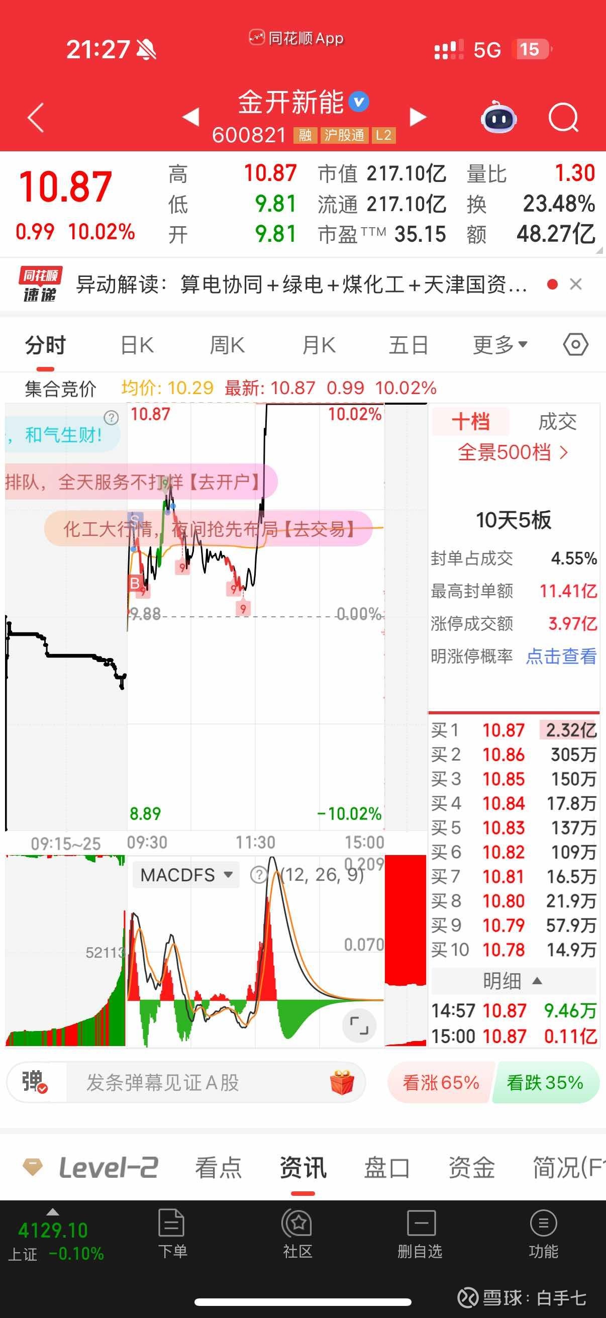 今日持仓: 金开新能会一直拿到大阴线收不回来走