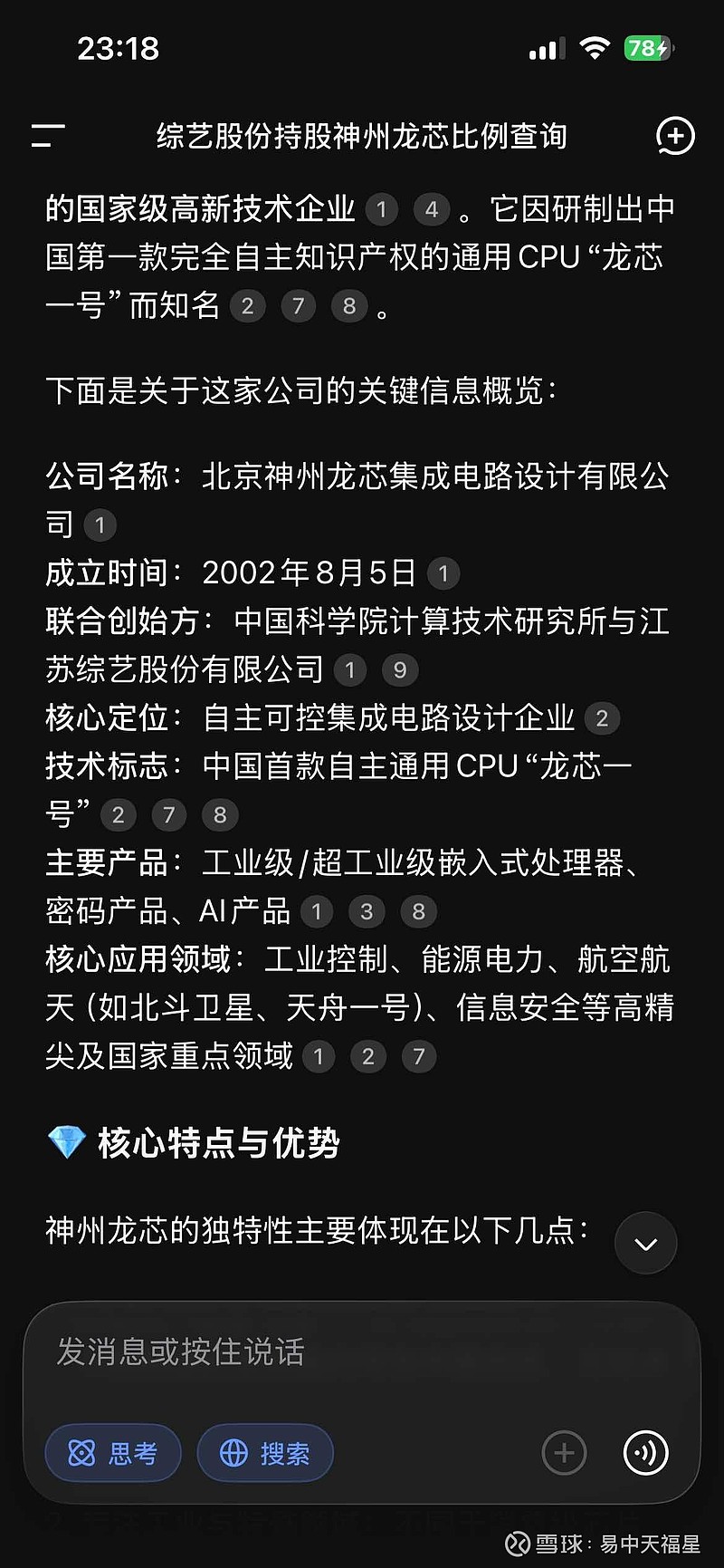 $综艺股份(SH600770)$ 综艺股份:被资本市场“遗忘”的一颗闪亮的明珠!因为它是神州龙芯第一大股东!参股比例高达38%!神州龙芯是一家承载着国家自主可控芯片战略使命的老牌AI技术企业!其AI产品核心应用领域为工业控制、能源电力、航天航空(如北斗卫星、天舟一号)、信息安全等高、精、尖及国家重点领域……!看图