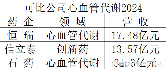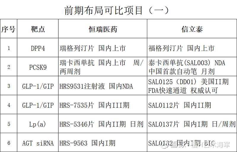 前面说了恒瑞有20款代谢心血管临床在研;信立泰有14款心肾代谢临床在研。在相同领域中公示的可比药品有6款,如下: