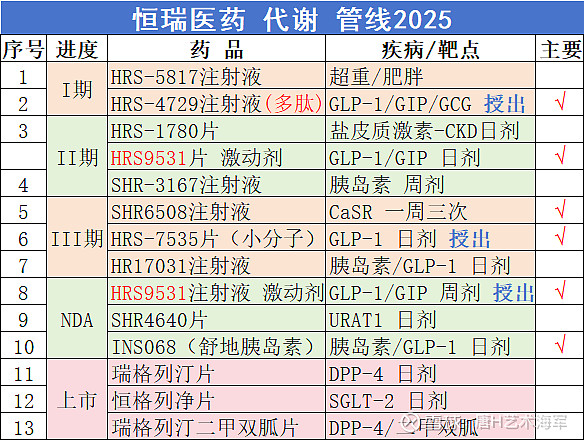 截至目前,恒瑞医药对外授权三项GLP-1系列产品,分别为代谢管线中的第2、6、8号序列: