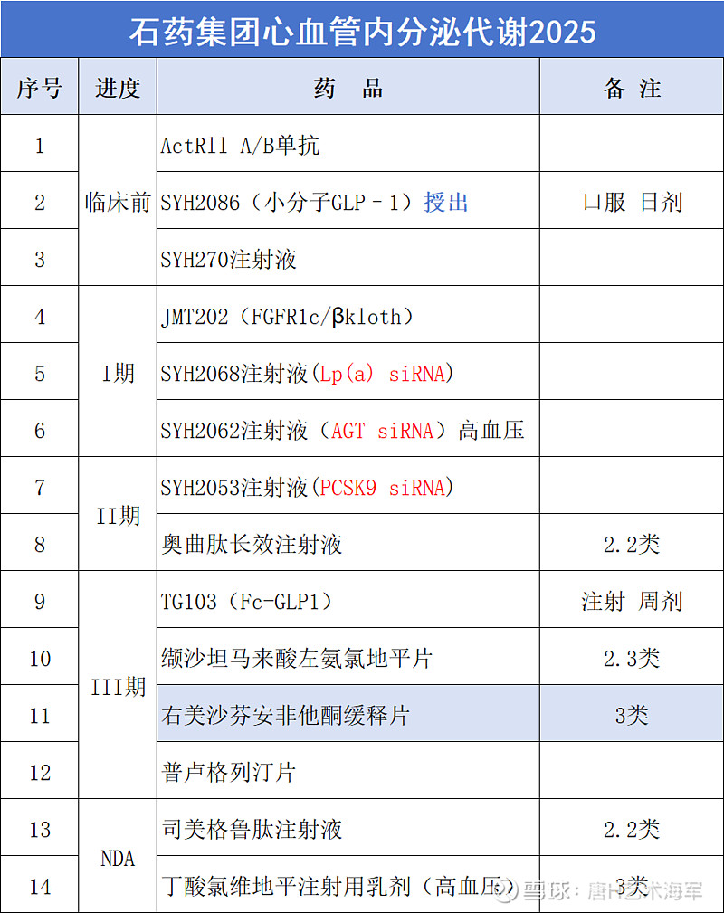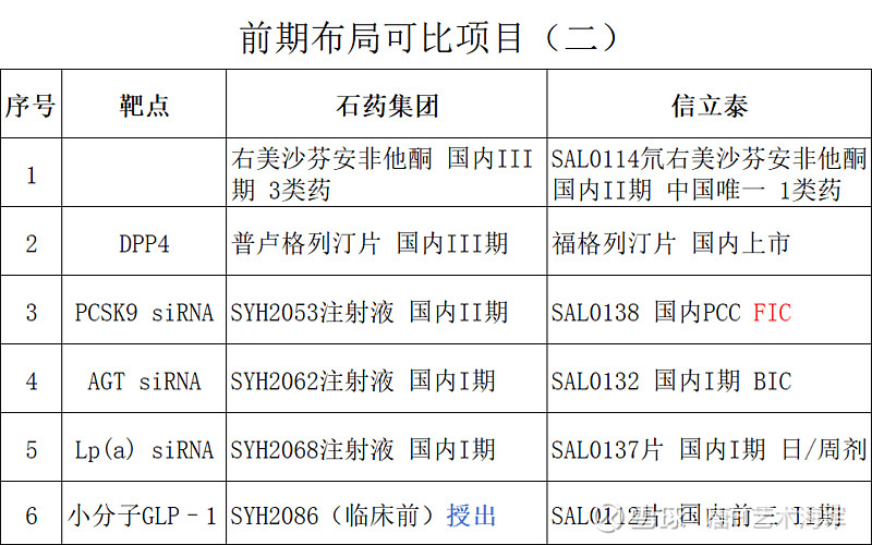 通过比较,虽然信立泰前几年布局及当前进入临床的创新药与大哥恒瑞相差6个(恒瑞20个,信立泰14个),但在6个可比项目中,信立泰有差异化,也有技术先进的一面。然而石药集团在心血管代谢领域也有14款新药在研。