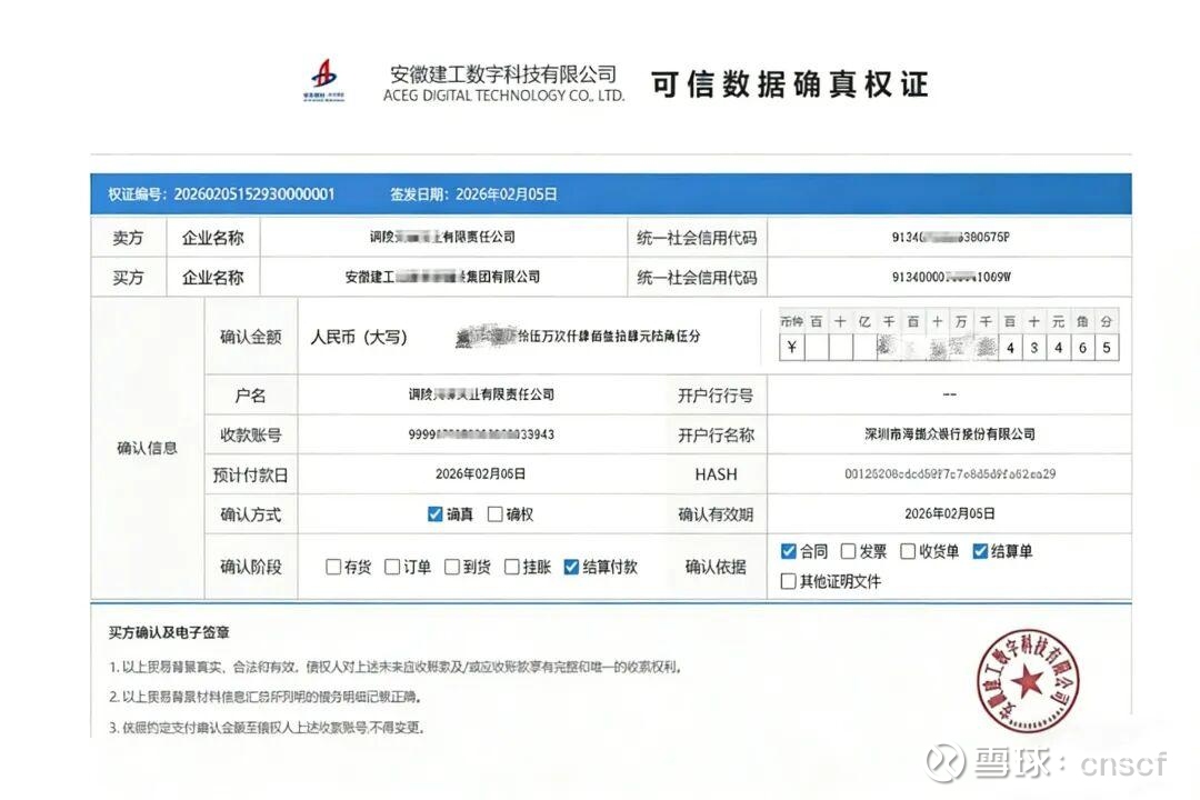 一张由安建数科成功签发的可信数据确真凭证,承载着铜陵某供应商与安徽建工集团之间的真实交易信息。在这笔筑链易融产品落地的典型案例中,铜陵某供应商依托安建数科搭建的可信数据空间,将其对安徽建工集团已结算未支付的应收账款,转化为银行认可的可信数字资产。