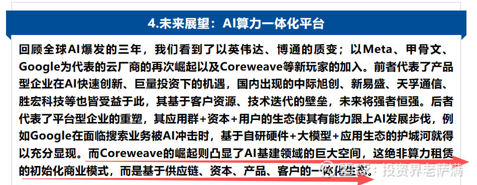 $协创数据(SZ300857)$ 回头看轻舟已过万重山AI算力主线中,硬件最先爆发拔估值,随后像协创这样AI算力一体化平台也会发力。引用国盛研报里的这句,我觉得套在协创上也完全契合:“而Coreweave的崛起则凸显了AI基建领域的巨大空间,这绝非算力租赁的初始化商业模式,而是基于供应链、资本、产品、客户的一体化生态。”无论是前期的高端算力集群建设,到延伸拓展光模块等供应链配套的补齐,最后还有物理AI Omnibot平台生态,协创未来的空间还是很值得期待的查看图片