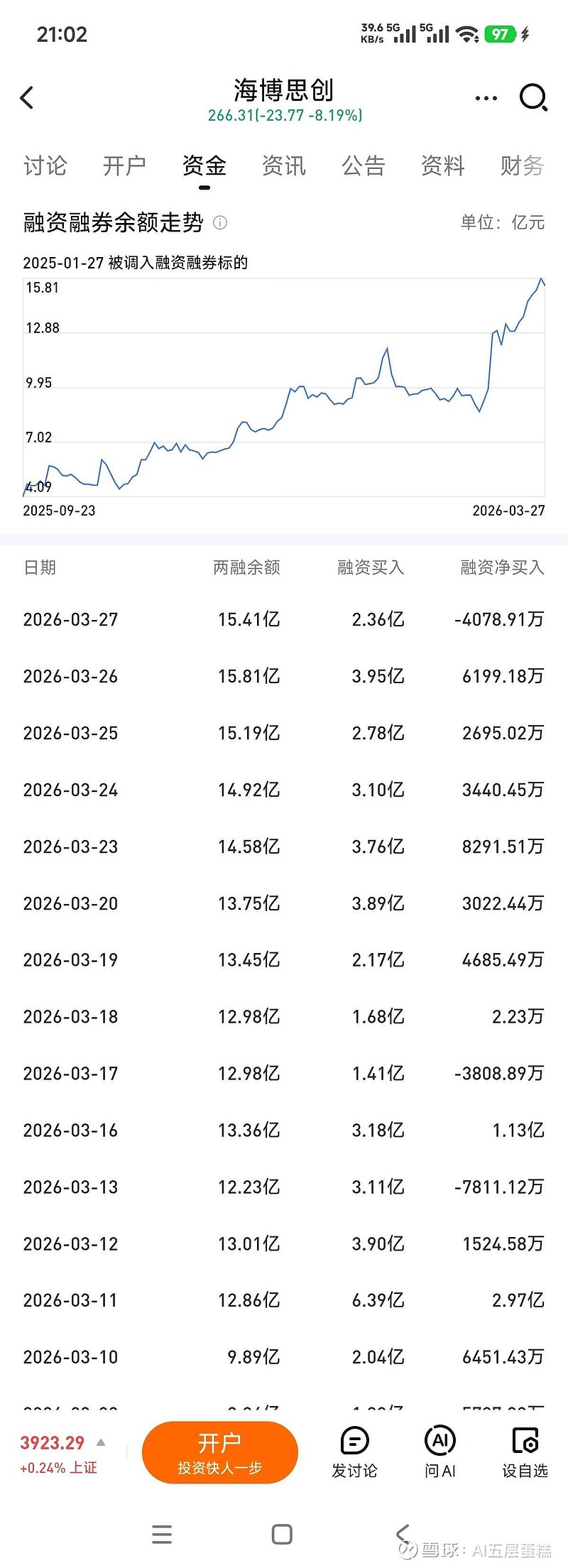 公司还是上周那个公司,周末财联社有海博的收费研报,中长线投资者没有必要焦虑。炒股是反人性的,给大家看一下融资图,其实可以换一个方式思考。