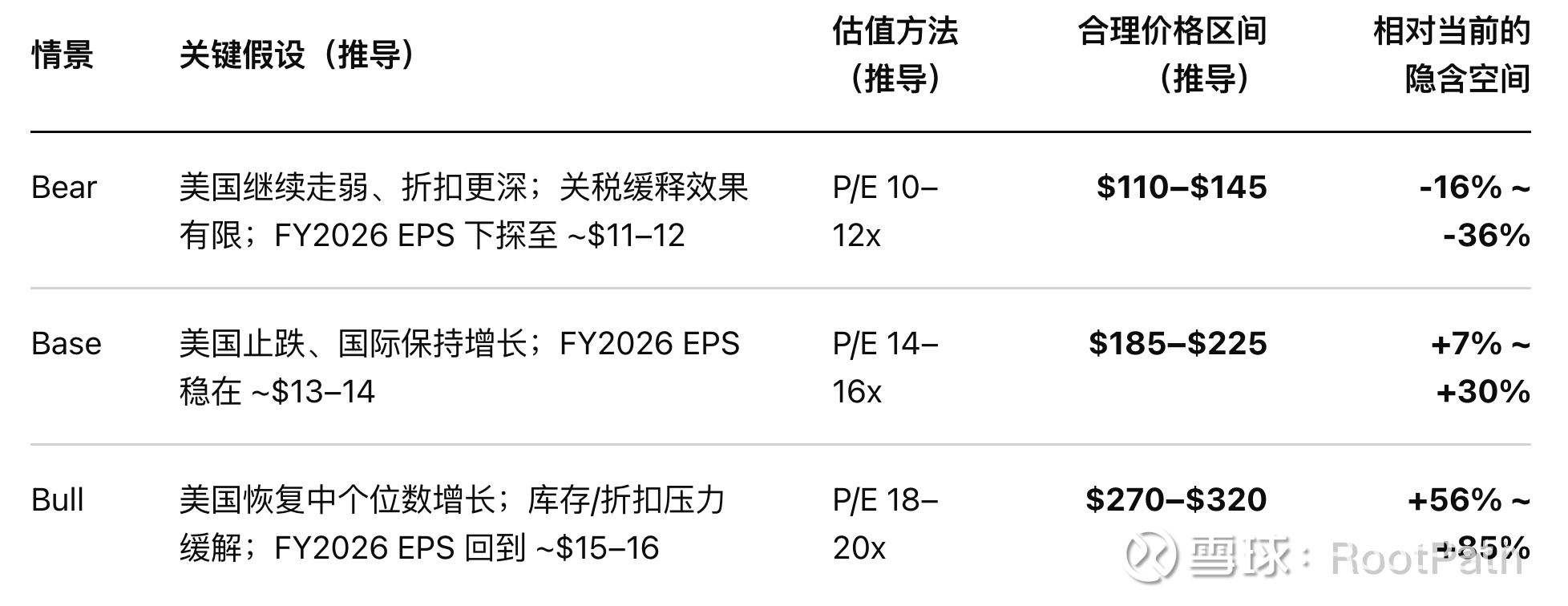 现在的低估值并不是纯粹错杀,而是市场在定价美国走弱、毛利下行、关税与管理层变动的不确定性;如果美国业务止跌,当前倍数具备修复空间,赔率偏正;如果美国持续走弱,低估值可能长期化,回报更多来自盈利自然增长与回购,而不是估值反转。[27]
