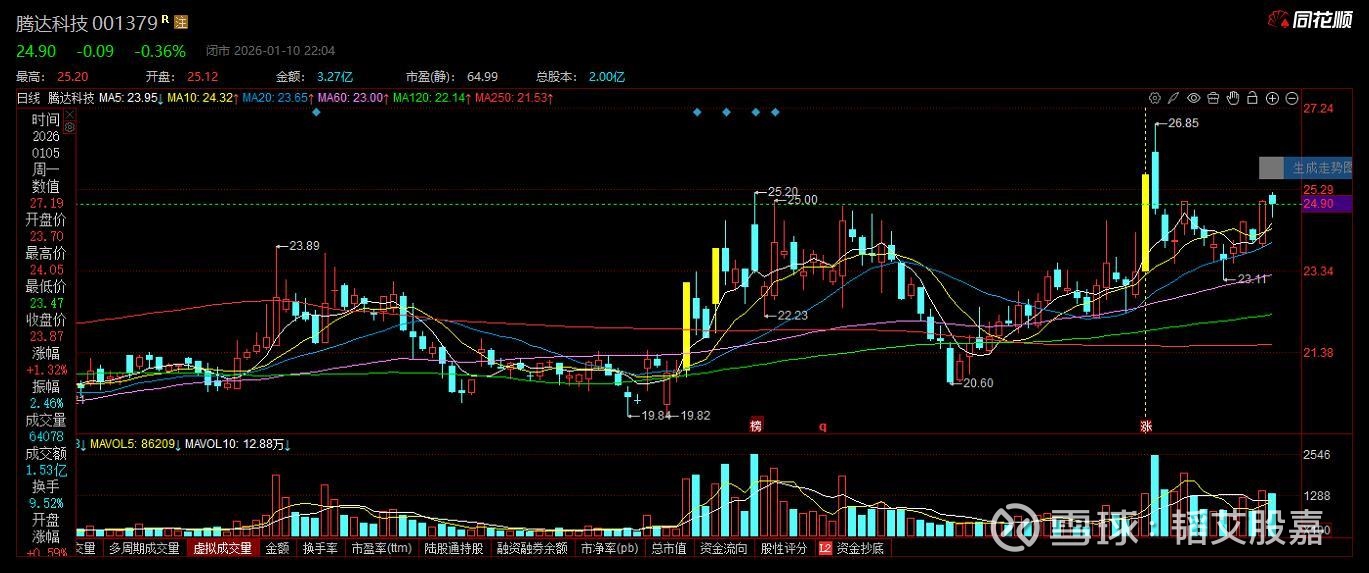 001379 腾达科技,具有涨停基因(核电+航天)公司基本面较为一般,估值非常高,技术走势较为突出。推荐时间:2026年1月10日, 推荐股价:24.9元$腾达科技(SZ001379)$