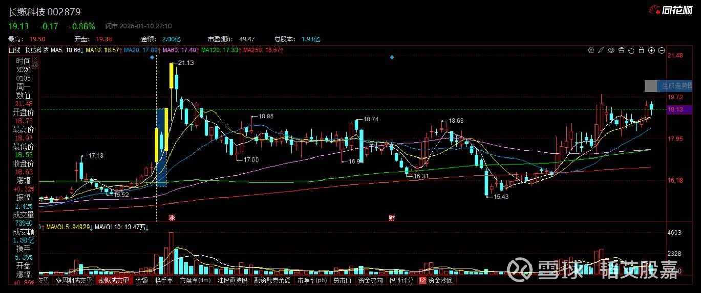 002879 长缆科技,具有涨停基因(商业航天+储能+核电+机器人+数据中心+智能电网)公司基本面较为一般,估值合理,技术走势较好。推荐时间:2026年1月10日, 推荐股价:19.13元