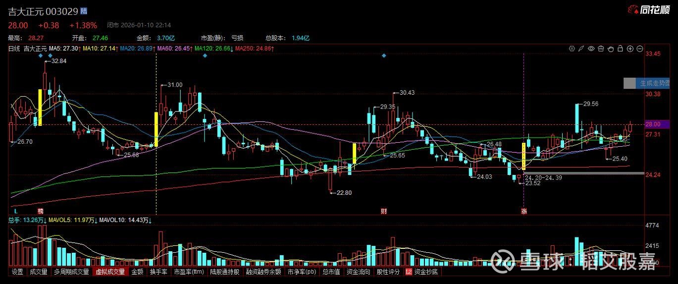003029 吉大正元,具备涨停基因(商业航天+量子科技+AI智能+车联网+跨境支付+互联网金融+数字货币+无人驾驶)公司基本面较差,估值非常高,技术走势较为理想。推荐时间:2026年1月10日, 推荐股价:28元$吉大正元(SZ003029)$