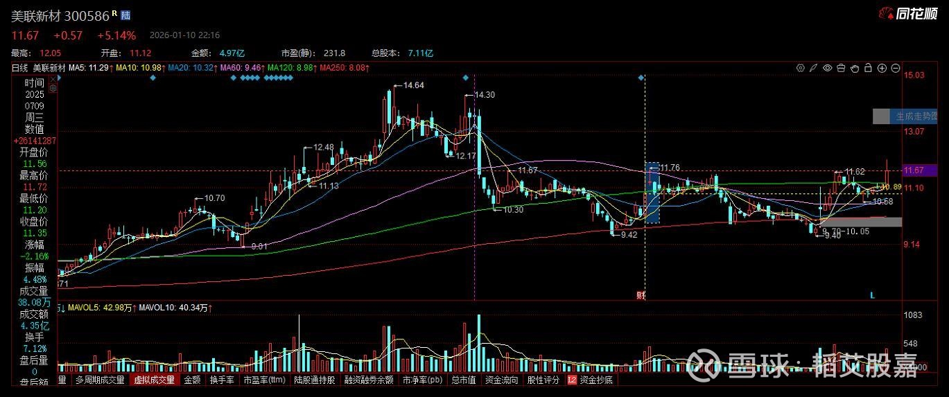 300586 美联新材,无涨停基因。公司基本面一般,估值较高,技术走势较为理想。推荐时间:2026年1月10日, 推荐股价:11.67元